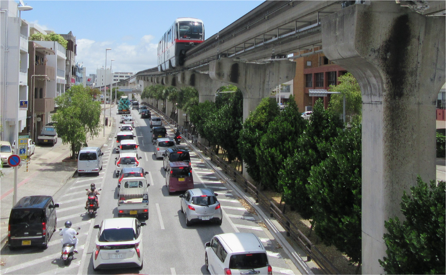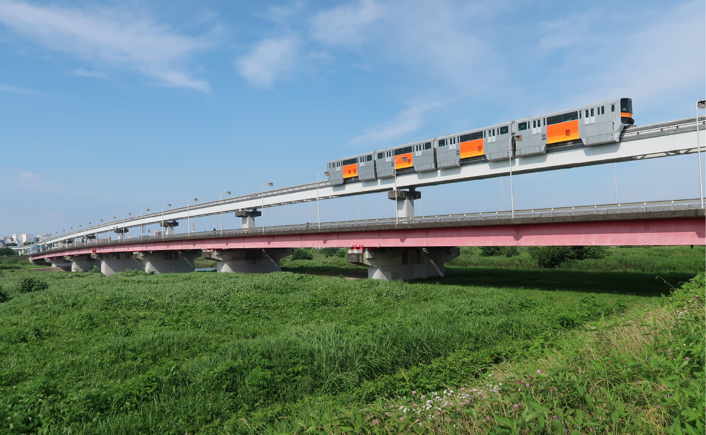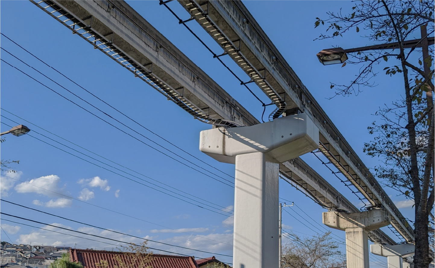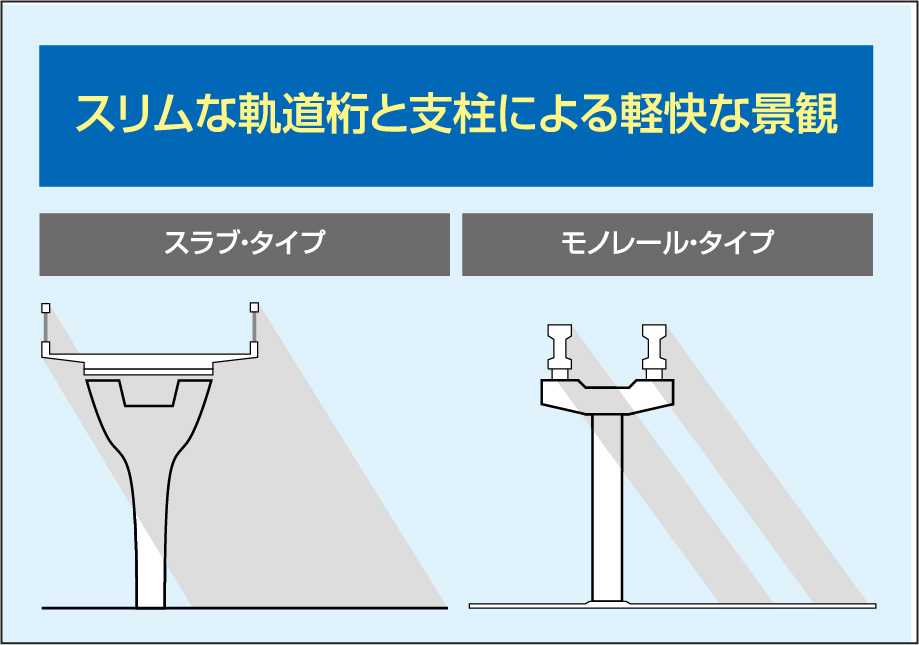 道路上空の専用軌道を走行するため、地上の交通渋滞に巻き込まれることなく安全に走行できます。 モノレール車両内から都市景観を見渡せるなど快適性が高く、都市空間の魅力の再発見にもつながります。また、軌道桁に跨座し、あるいは箱形の軌道桁内を走行する台車に懸垂して走行するため、脱線の恐れがなく、風雨、降雪などの厳しい自然条件にも対応可能です。