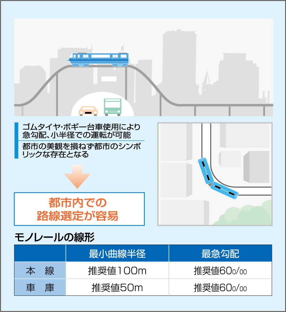 また、ゴムタイヤ式ボギー台車※を使用しており、小半径の曲線や大きな縦断勾配となる線路の設定も可能であることから、都市内の限られた空間への導入や起伏の大きな地形への適用も可能です。※ボギー台車とは、車体に対して水平方向に回転可能な装置を もつ台車の総称。